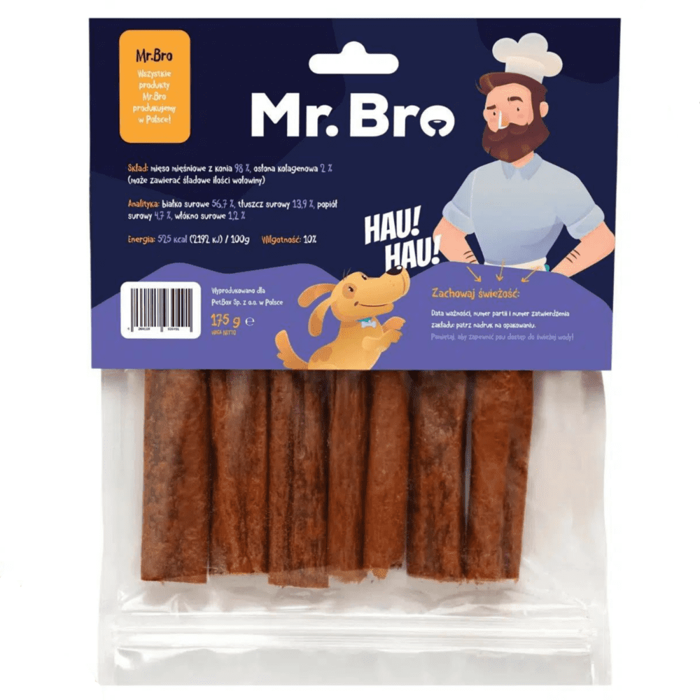 Mr.Bro Cygara z Koniny to w pełni naturalny przysmak. Przekąska charakteryzuje się dużą zawartością głównego składnika (koniny), bo aż 98% składu to mięso mięśniowe. Cygara są przystosowane zarówno dla małych jak i dużych ras oraz na każdym etapie życia. To idealne rozwiązanie dla psich alergików oraz tych z nietolerancją pokarmową. Nadają się jako nagroda lub posiłek uzupełniający. Produkt nie zawiera żadnych konserwantów, barwników, zbóż. Prosty skład, który mieści dwa składniki. Pod wpływem gryzienia cygaro mięknie, dzięki czemu zwierzak nie będzie miał problemu z przełknięciem przysmaku. Należy pamiętać o zapewnieniu psu stałego dostępu do świeżej wody.