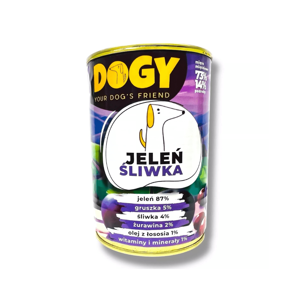 Naturalna, odżywcza i lekkostrawna! DOGY – Karma mokra Jeleń ze Śliwką to doskonałe rozwiązanie dla psów, które potrzebują wysokiej jakości, monobiałkowego posiłku z prostym i klarownym składem.