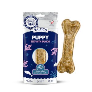 Naturalna kość z łososiem dla szczeniąt, która zaspokaja potrzebę żucia i gryzienia, dedykowana psom powyżej 3 miesiąca życia. Gryzak ma ok. 12 cm długości dzięki czemu będzie odpowiedni zarówno dla szczeniąt małych, średnich jak i dużych ras. Kość daje się delikatnie zgryzać, nie pozostawiając niebezpiecznych czy ostrych fragmentów.