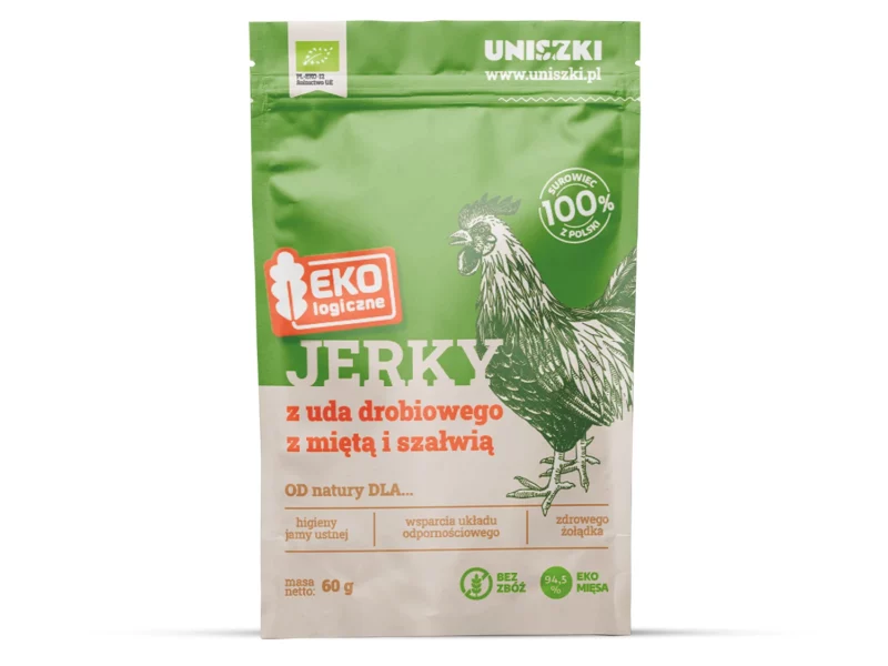 Ekologiczne jerky z uda drobiowego z miętą i szałwią 60g – Uniszki